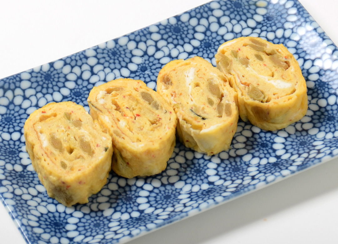 卵焼き器にサラダ油を入れて熱し、卵液の1/4を流し入れて広げ、半熟の状態で奥から手前に向かって巻き、端に寄せる。